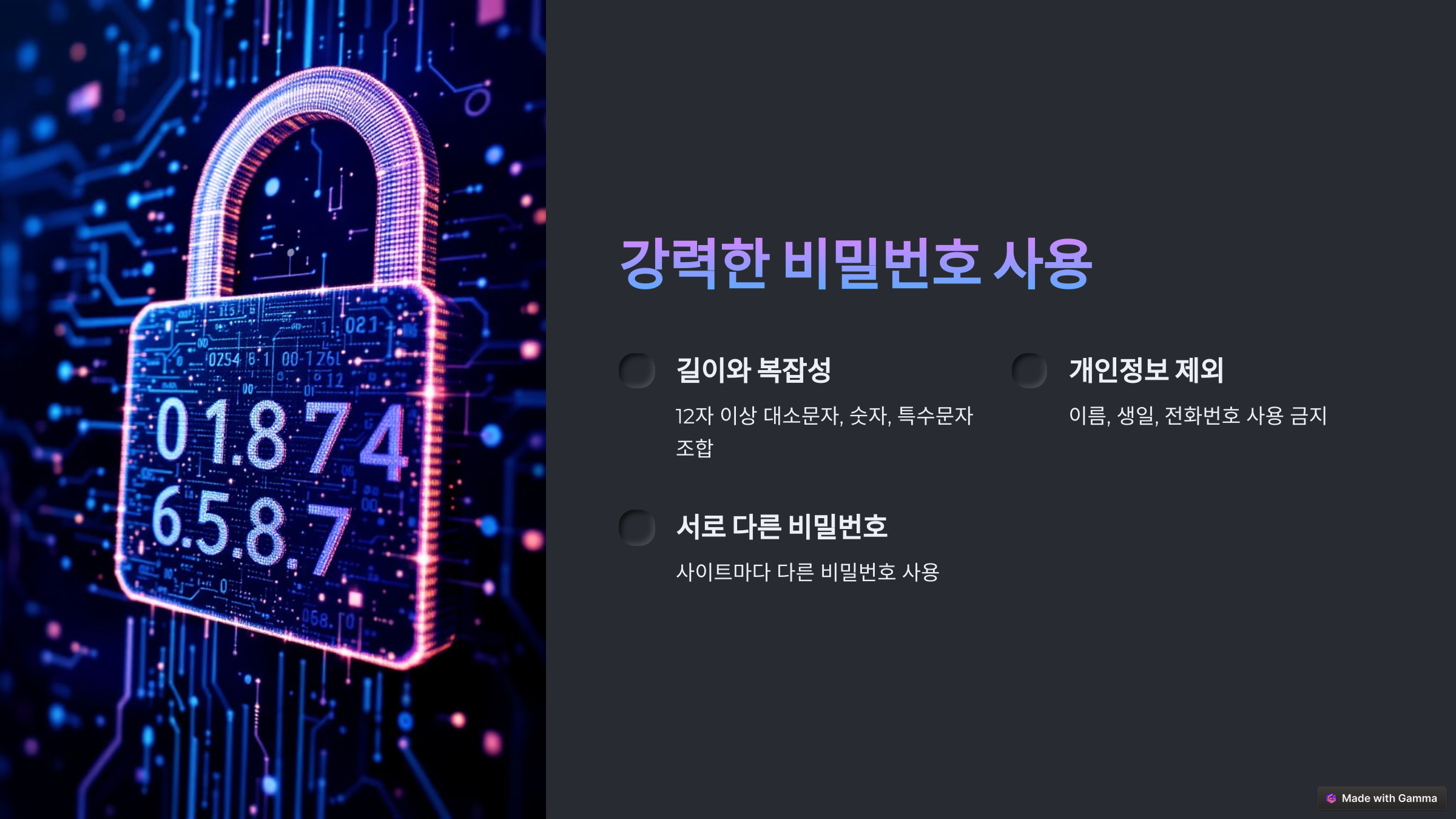 해커들은 약한 비밀번호를 이용해 계정을 쉽게 탈취할 수 있습니다. 따라서 강력한 비밀번호를 설정하는 것은 보안의 기본입니다.