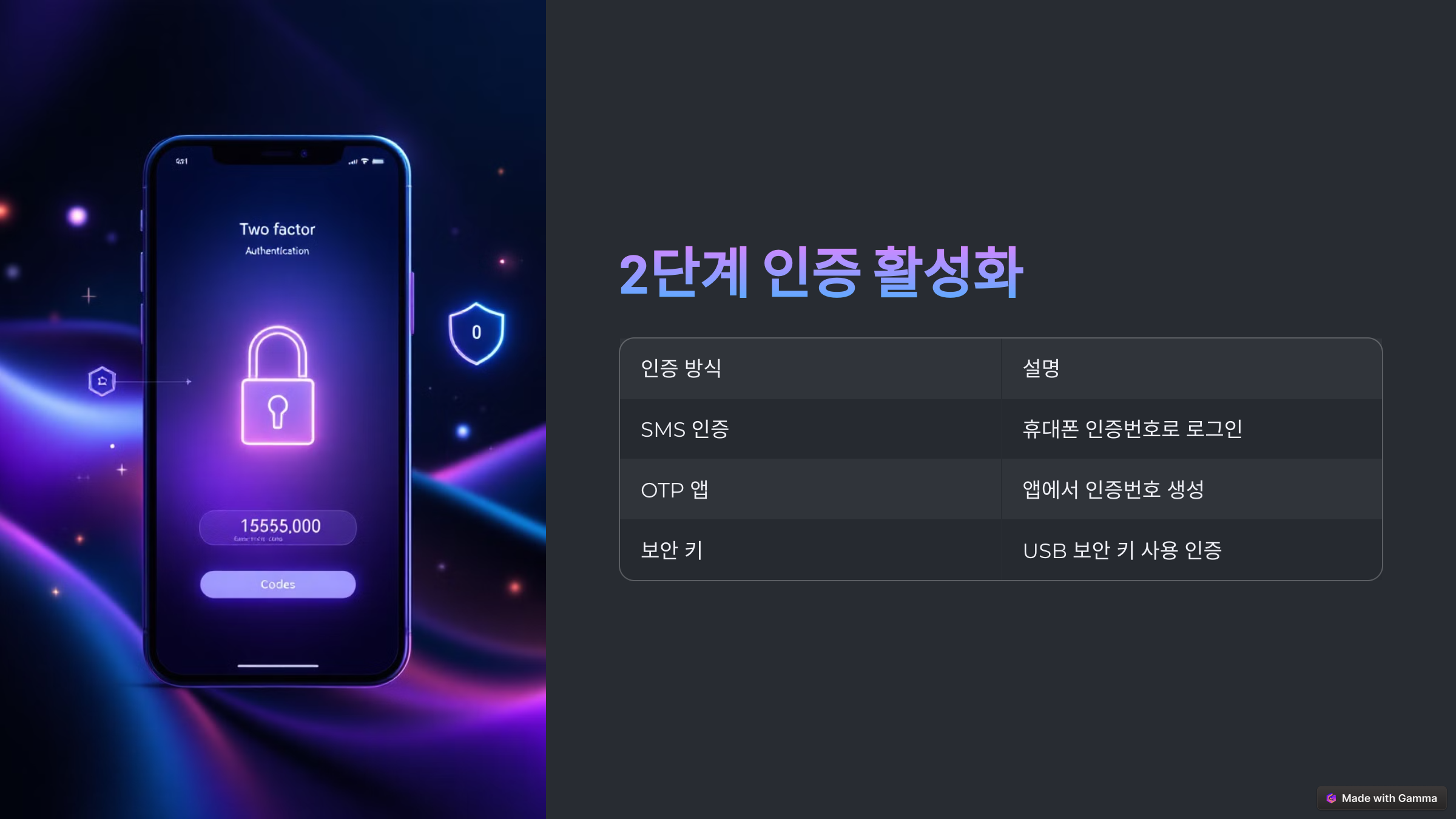 | OTP 앱 | Google Authenticator 등의 앱에서 인증번호 생성 |