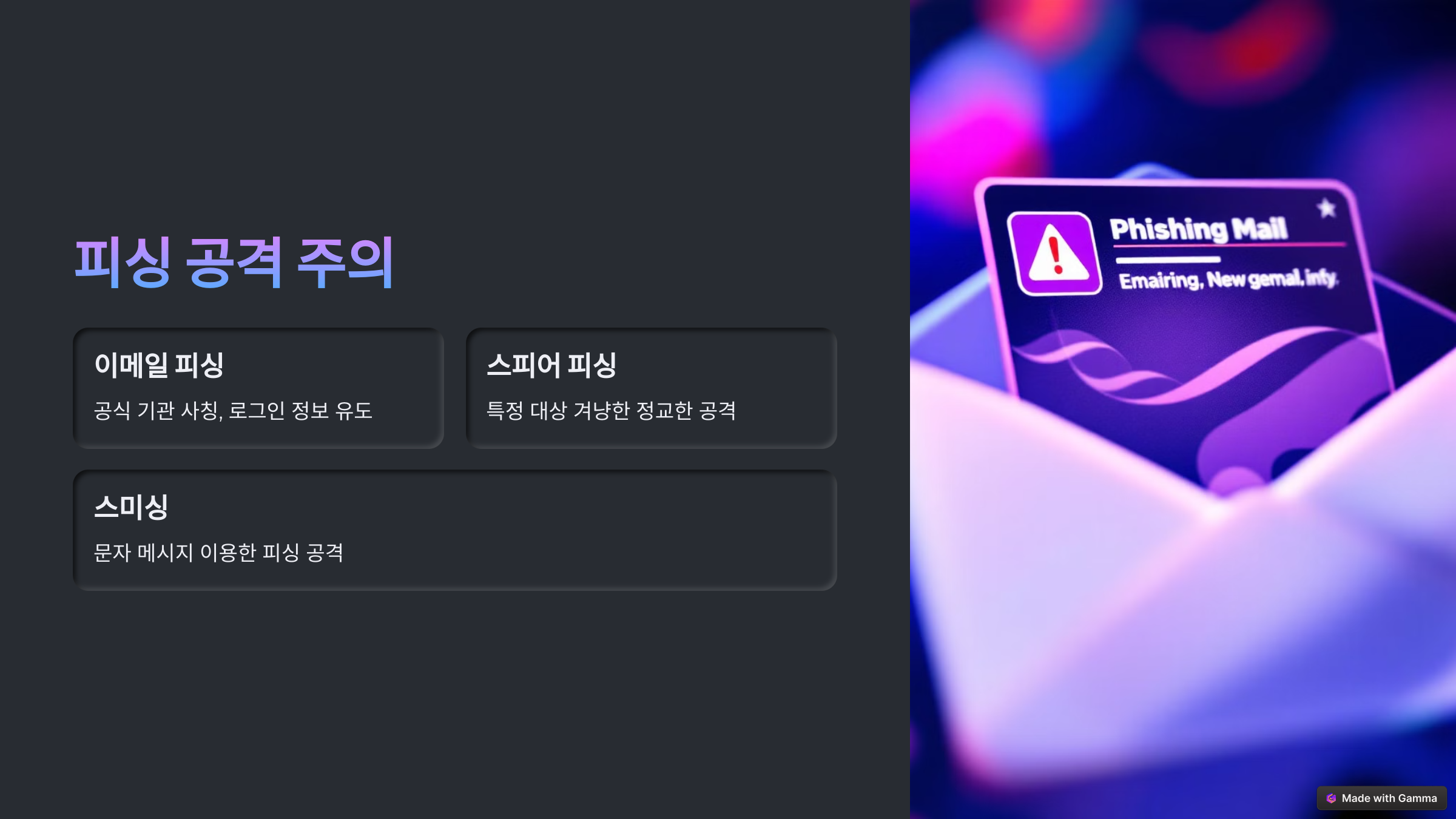 | 이메일 피싱 | 공식 기관을 사칭하여 로그인 정보를 유도 |