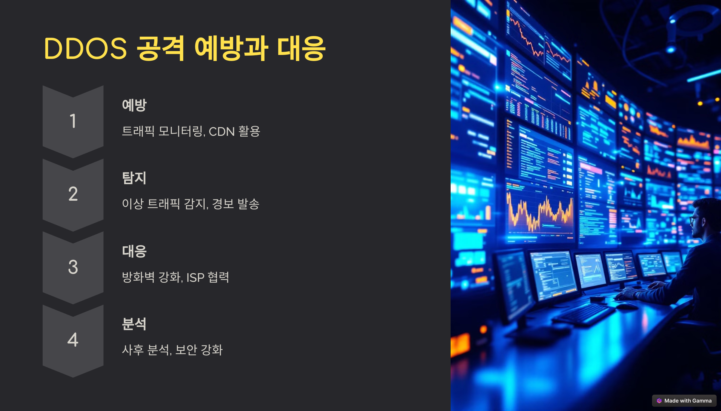 트래픽 패턴을 분석하여 공격 여부를 확인하고, 방화벽 및 보안 솔루션을 즉시 강화해야 합니다. 또한, ISP(인터넷 서비스 제공업체)와 협력하는 것이 중요합니다.